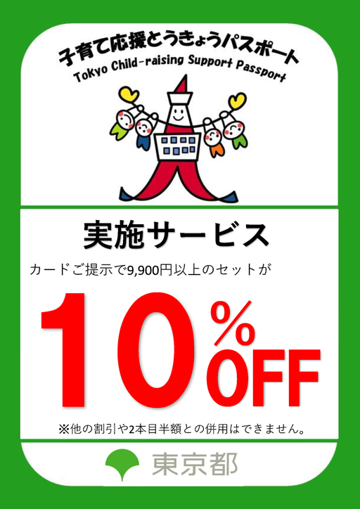 子育て応援とうきょうパスポートご提示で10%OFFになります!!是非、ご活用ください!!